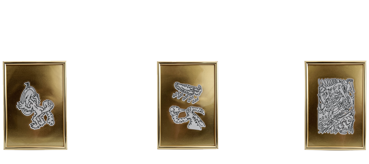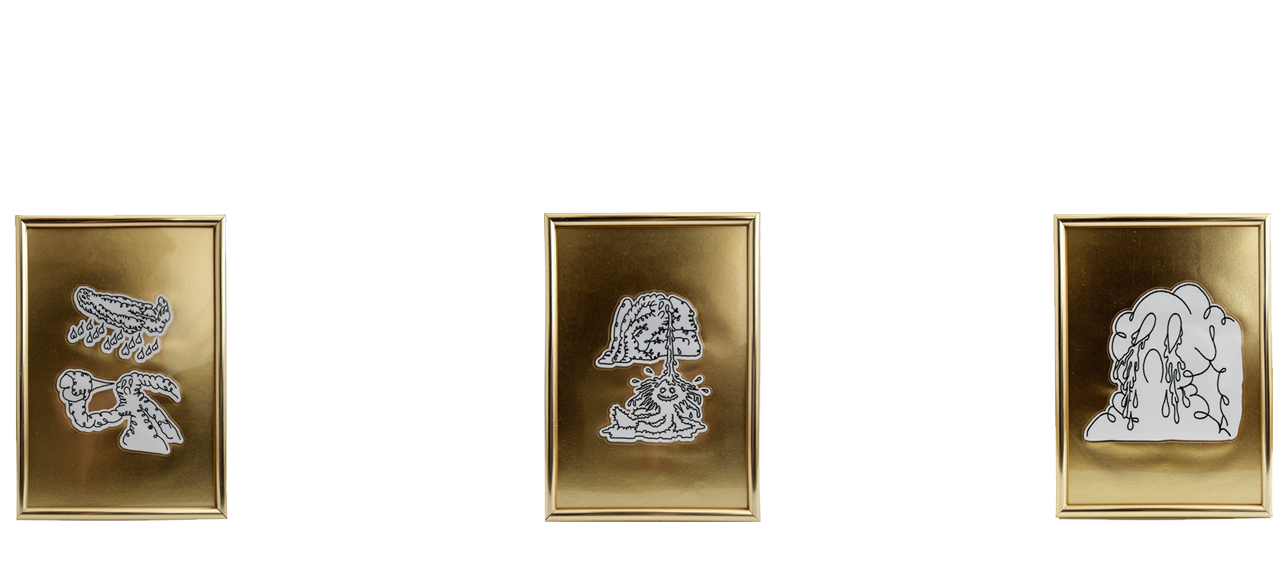 As part of the development of pieces for the "Looking for Me in You" project or collection, this open series of prints on gold vinyl framed in two formats was published. It presents 11 emblematic drawings from the collection. Open edition. Signed by the artist. Marked digital print. Gold vinyl. Measurements: 10x15cm / 13x18cm