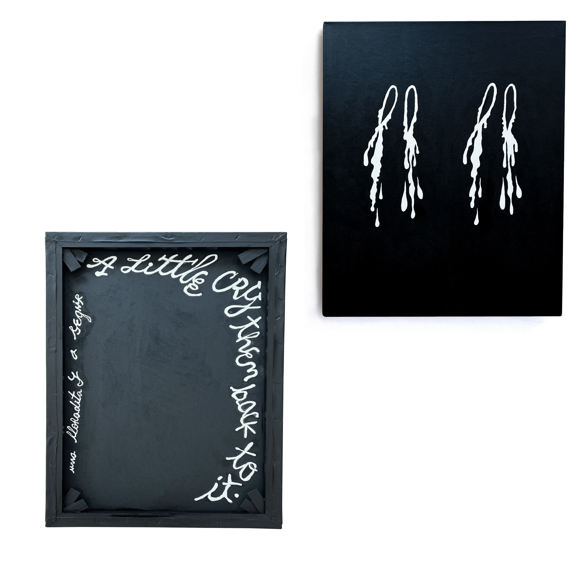 Estas pinturas son parte de una edición limitada única de la serie Buscándome en ti. Imágenes alteradas, síntesis, interpretaciones misteriosas y escenas de los dibujos originales del Zine participan en esta serie. Cada pintura lleva un mensaje oculto en la parte posterior, lateral o marco de madera, aludiendo al concepto de la serie. Serie de pinturas Buscándome en ti. Pintura acrílica sobre lienzo enmarcado en madera (50 x 70 cm).