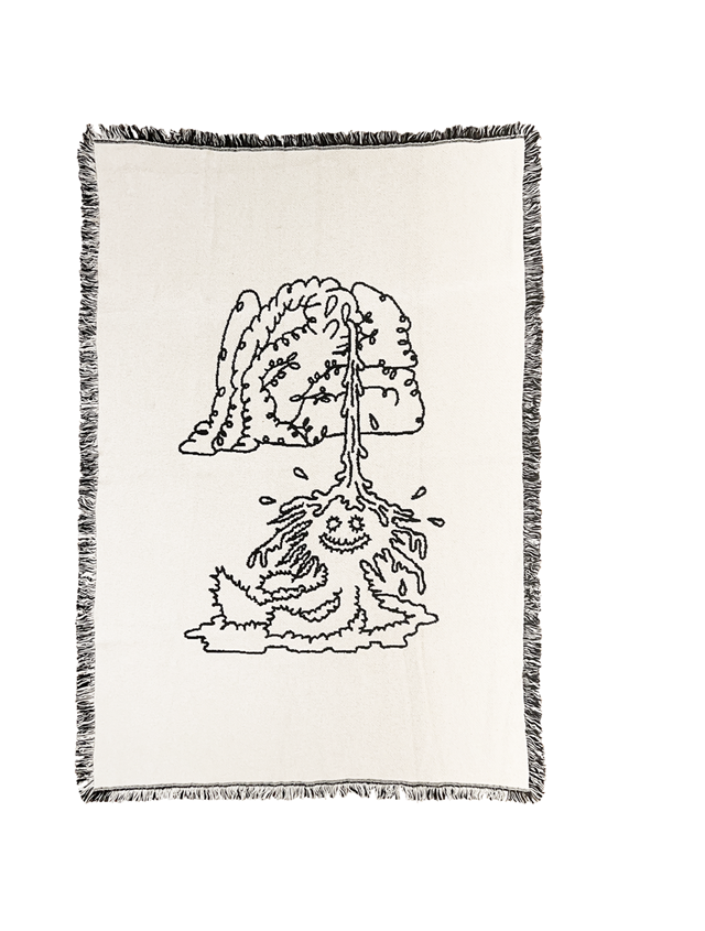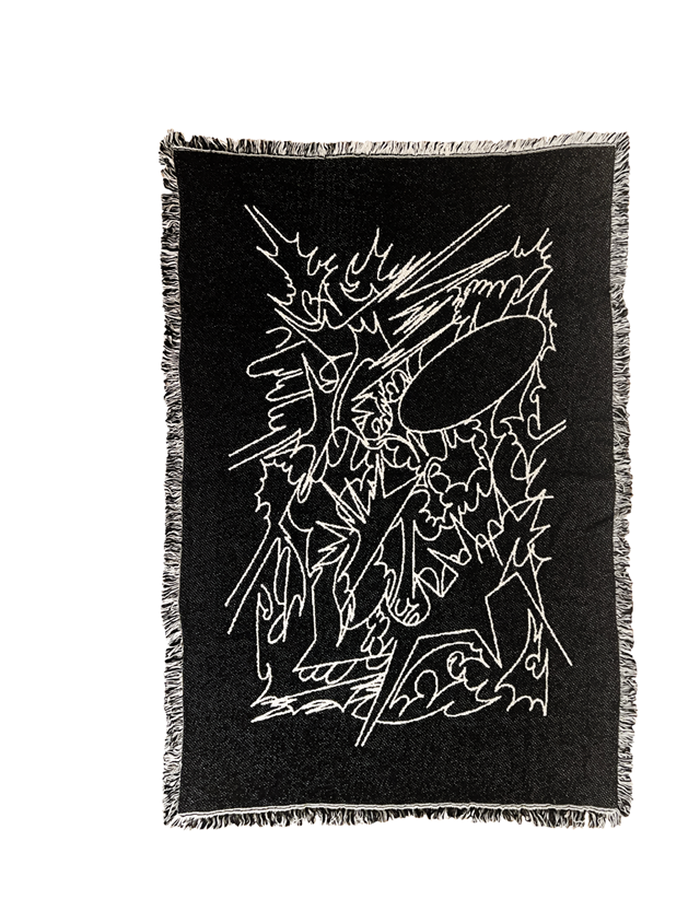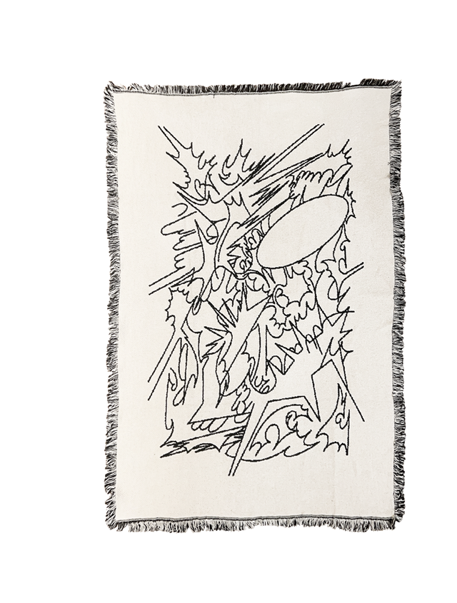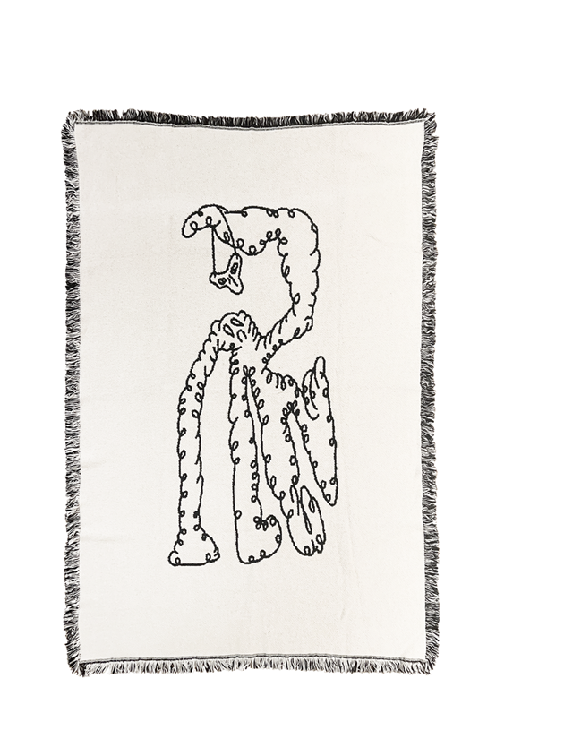 Como parte del proyecto “Looking for myself in you” y dentro de la plataforma de desarrollos del proyecto OTI, se confeccionaron algunos de los dibujos de dicha colección en mantas de algodón manufacturadas industrialmente. Las mismas son de jacquard con borde con flecos y están tejidas a 2 colores. Tamaño: 137 × 183 cm